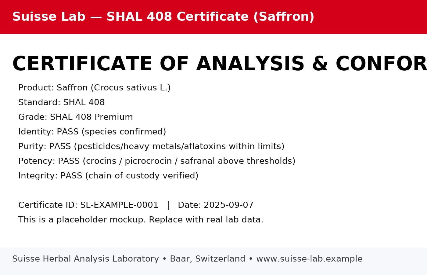 SHAL 408 is the next-generation, laboratory-based quality framework for Crocus sativus L. (saffron), ensuring identity, purity, potency, and integrity through advanced methods.